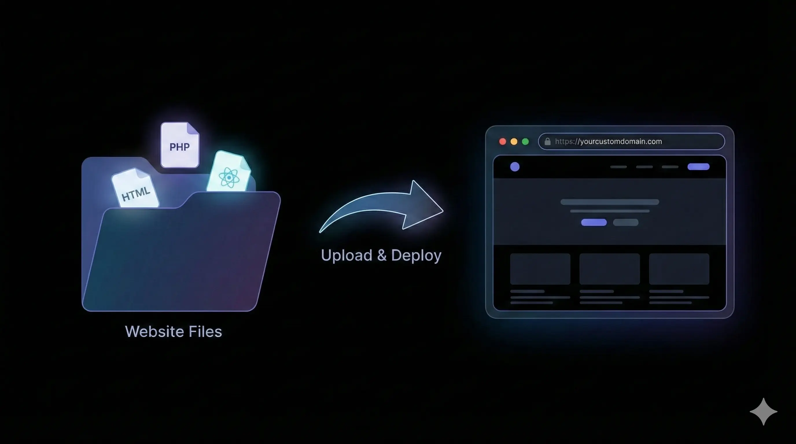 Upload folders or ZIP files containing HTML, CSS, JavaScript, images, fonts, and static assets. If it runs in a browser without a server, it’s supported.